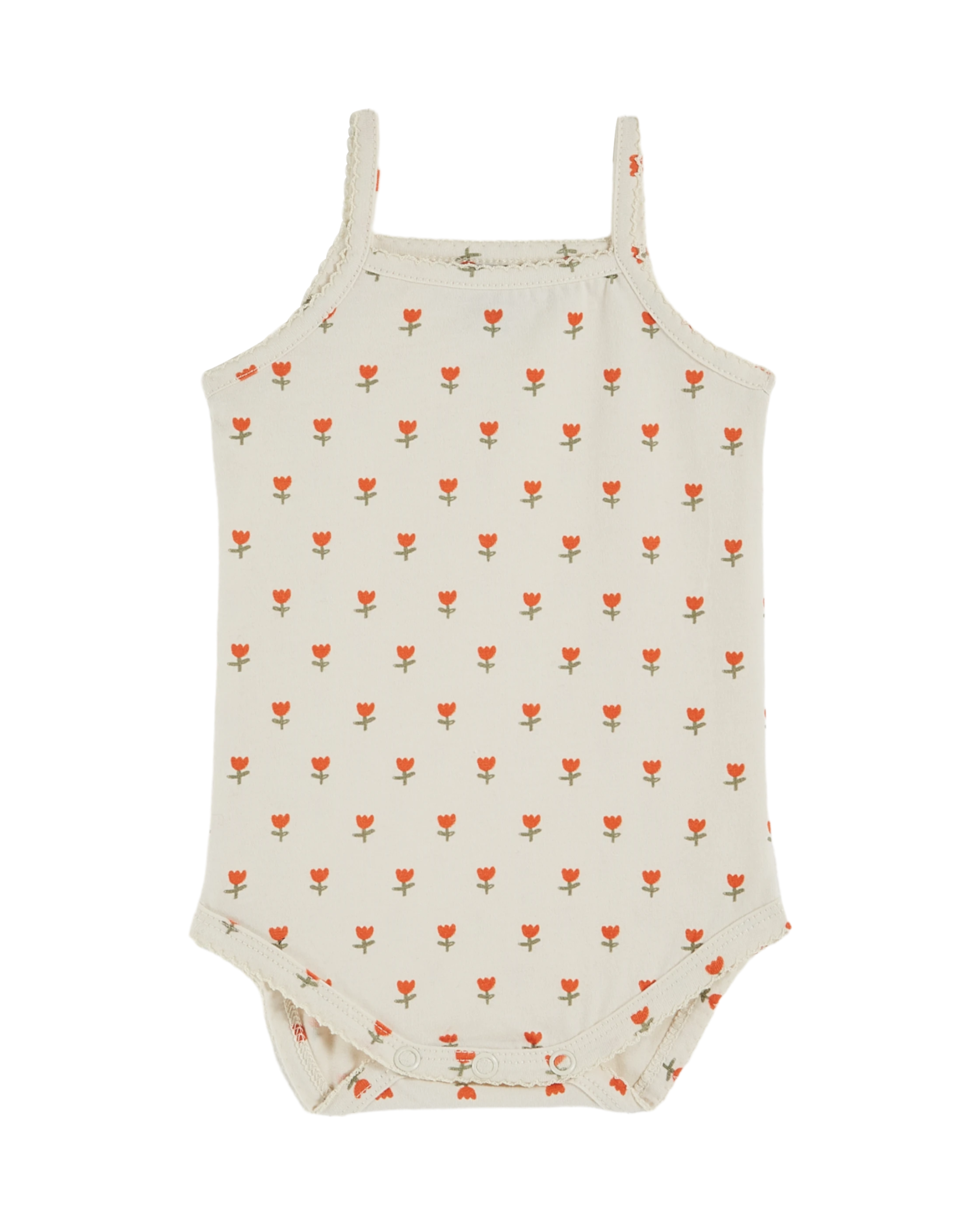 Off-white cotton-elastane jersey bodysuit featuring tulips with vermilion-red petals. Body with straps and square neckline. All edges are finished with a ribbed trim, enhanced by a tone-on-tone picot stitch. Three snaps at the crotch allow the bodysuit to be slipped on for easy changing.