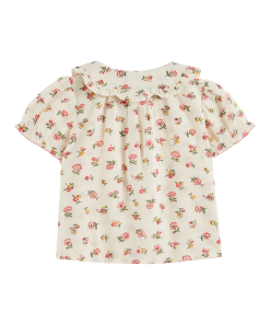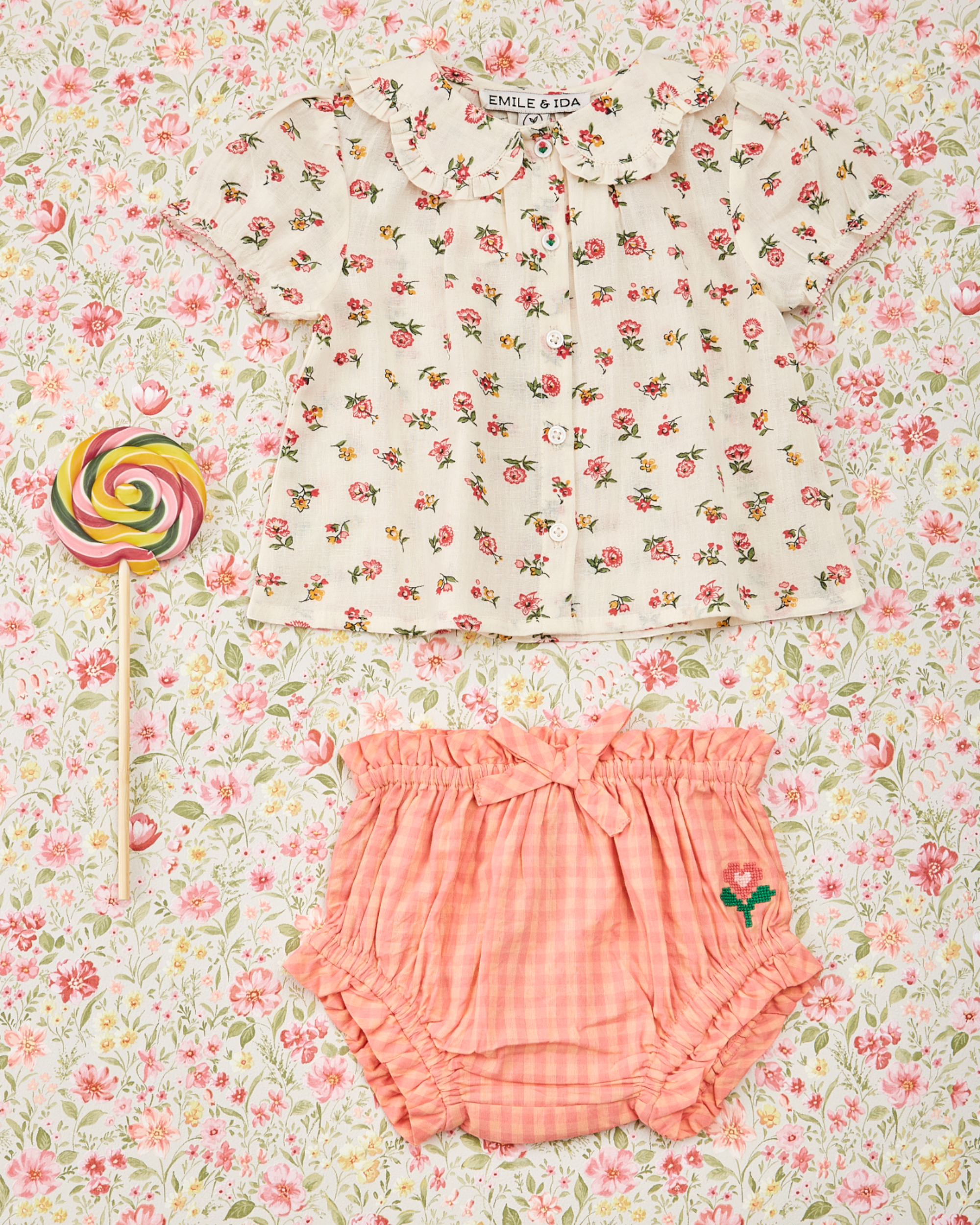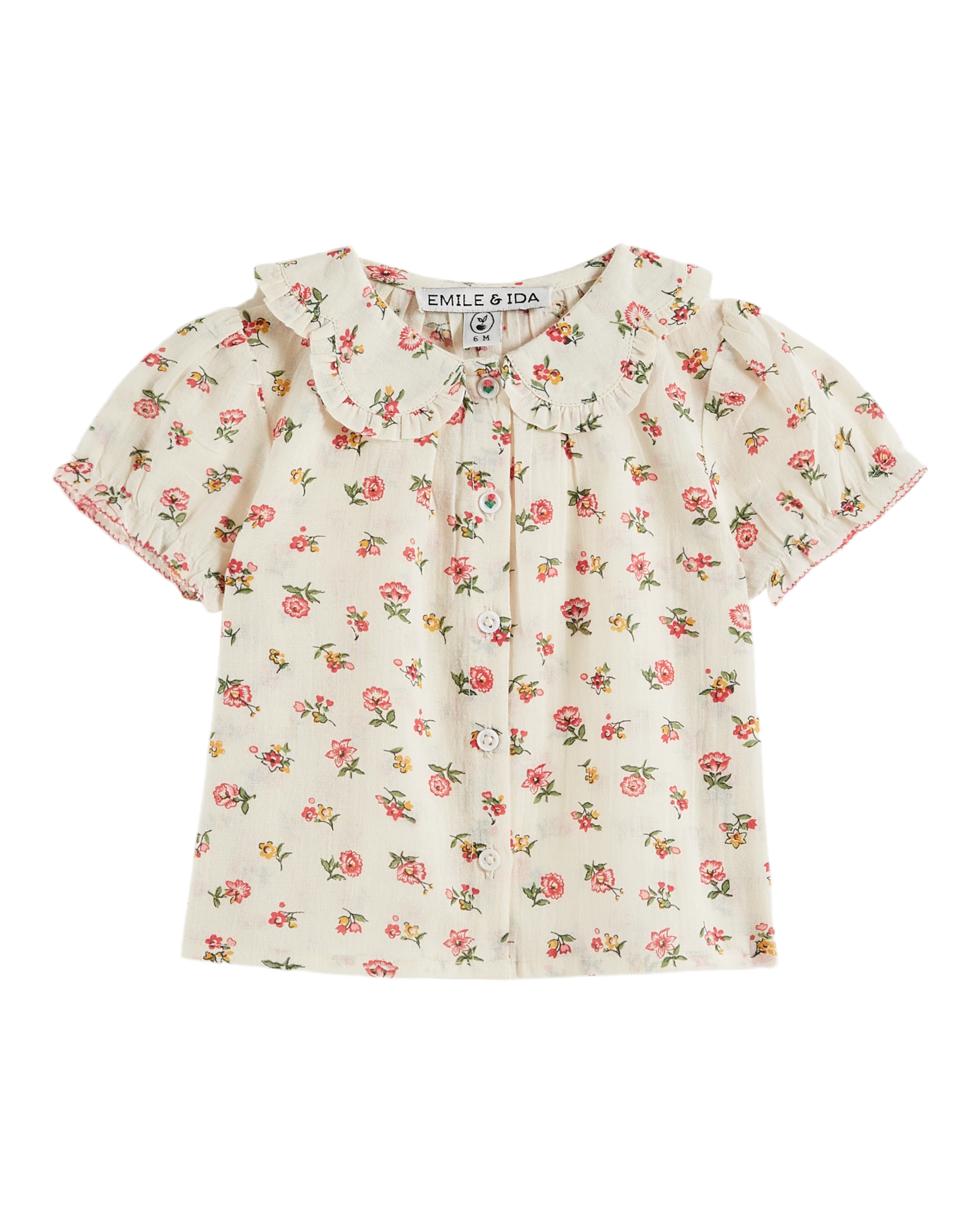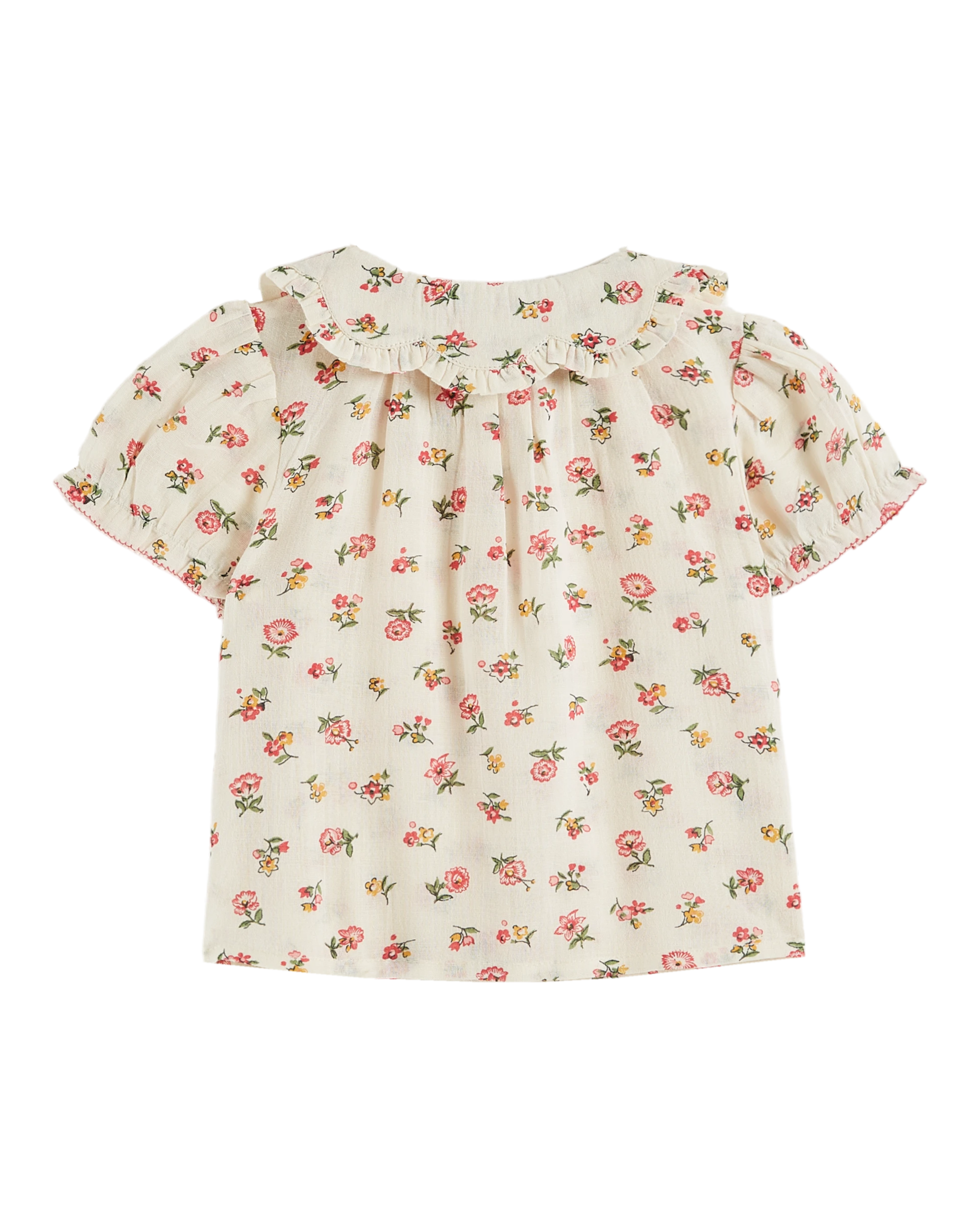 Off-white cotton blouse with multicolored flowers. Elasticated balloon sleeves, natural mother-of-pearl buttons, gathers around the neckline, English seams that reinforce the solidity of the assembly and ensure the durability of the piece for subsequent children. Then there are the details that make this blouse unique. The bottom sleeves are hemmed with picot stitch, the first two buttons are sewn in crow’s feet like flower embroidery, and the flat collar is scalloped like petals, then finished with a narrow flounce.
