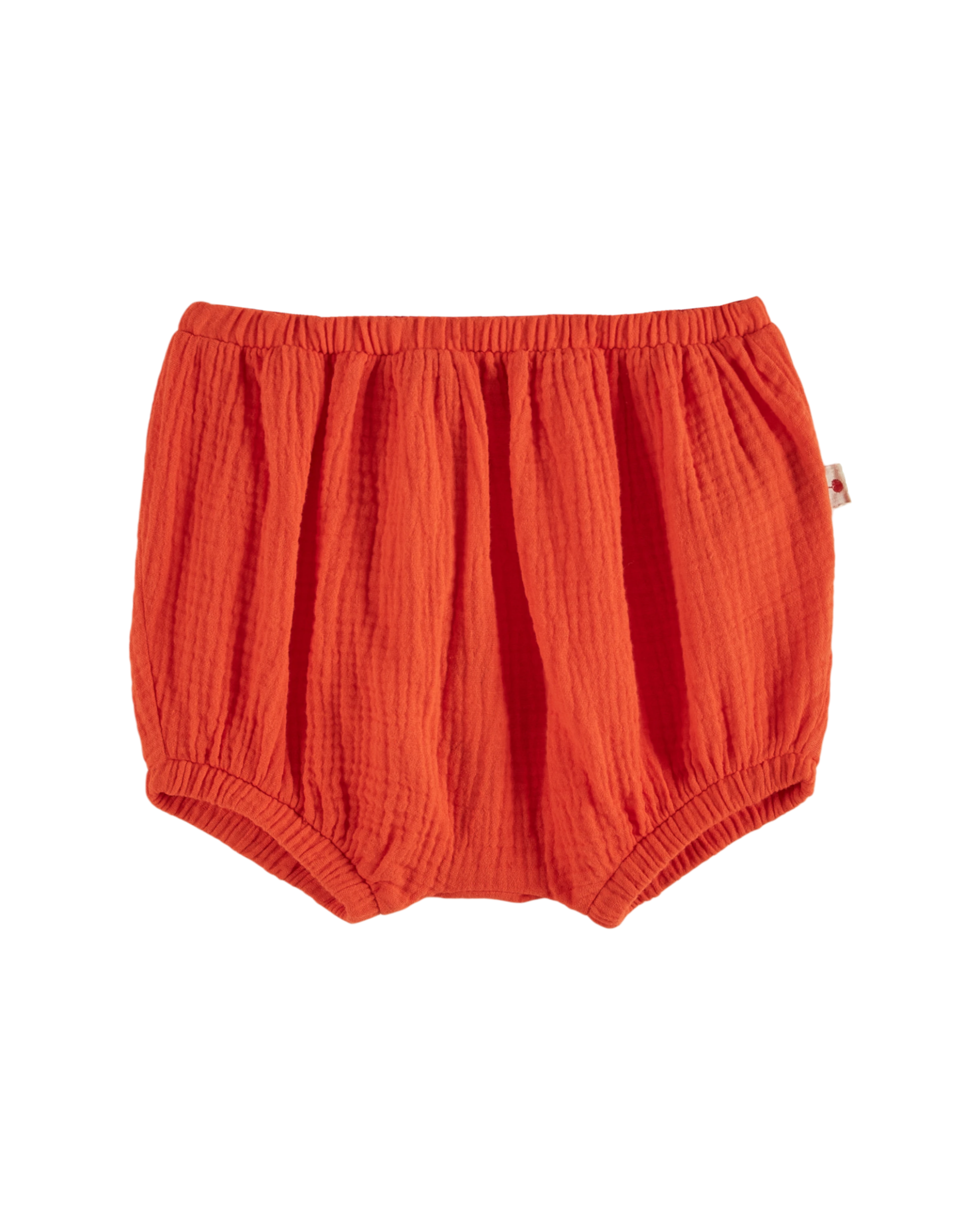 Bloomer in red cotton double gauze. We love the soft, lightweight cotton and comfortable shape. A little bloomer with a belt and elasticated thighs.