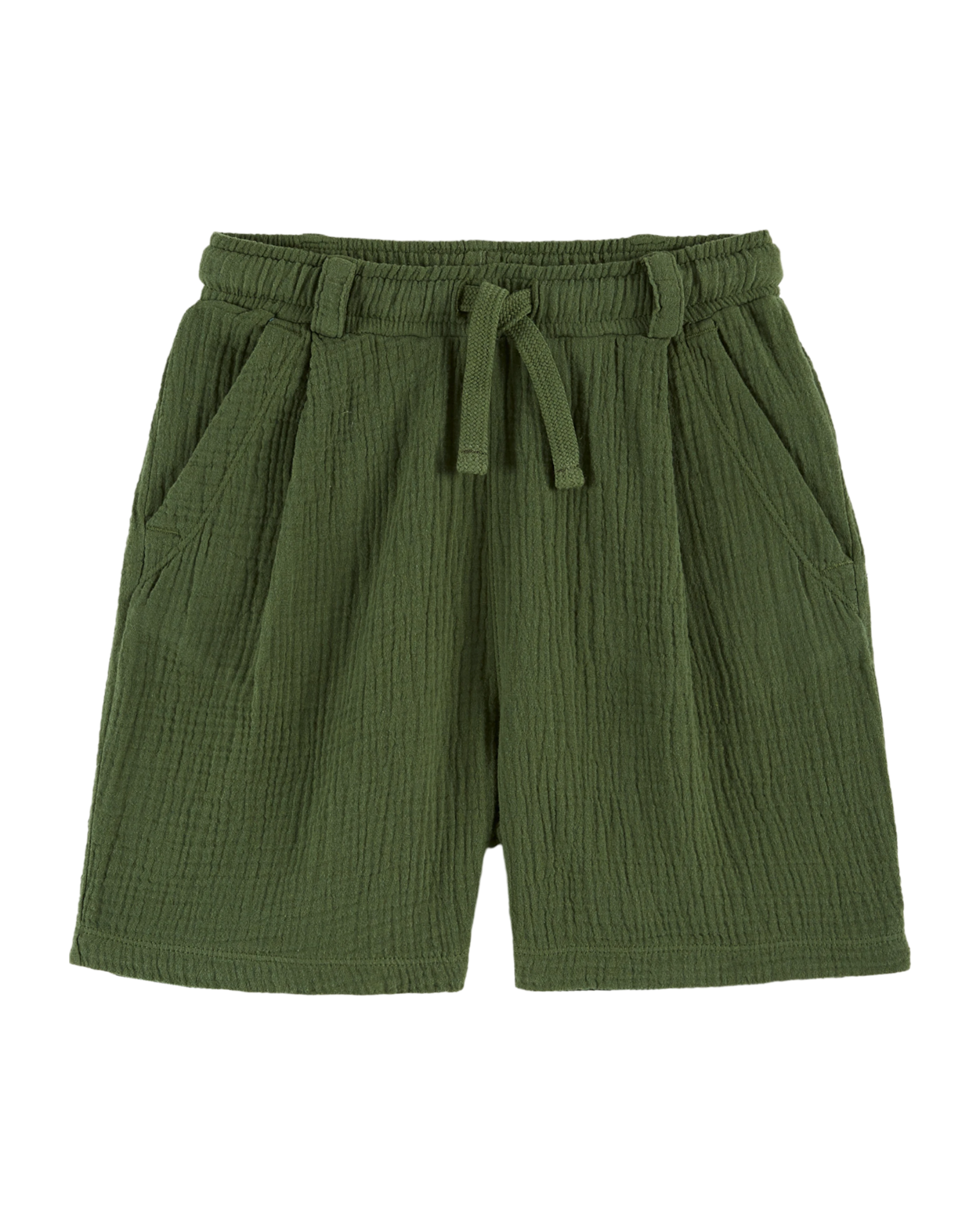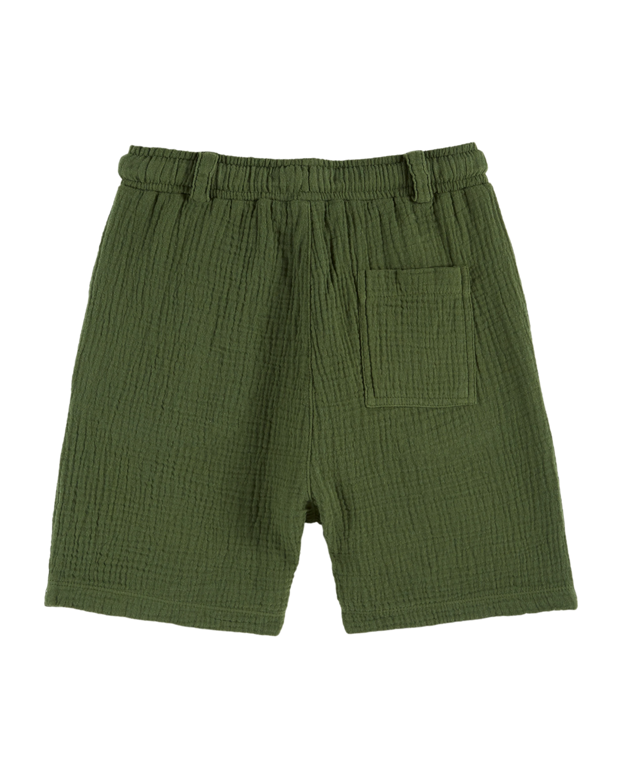 Pegged shorts in khaki green cotton double gauze. Featuring a back yoke, two Italian pockets and a patch pocket on one buttock to keep treasures close at hand, the shorts are mounted on an adjustable elasticated waistband with a tonal cotton twill tie, adapting to all sizes. It’s so easy to take off and put on that even the youngest will be able to play grown-up and dress themselves.