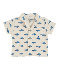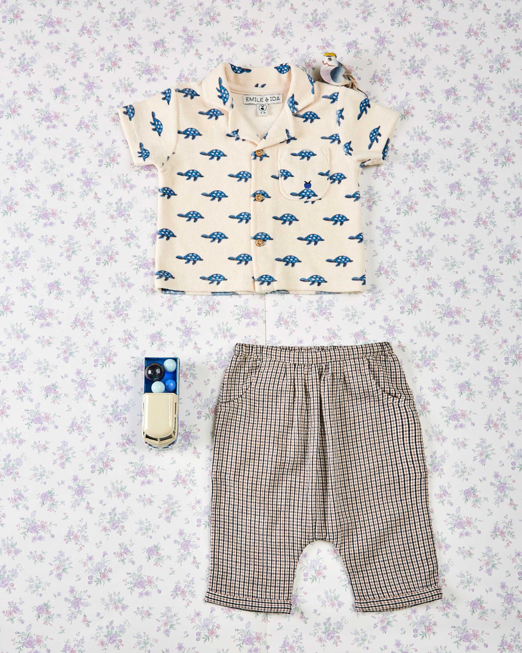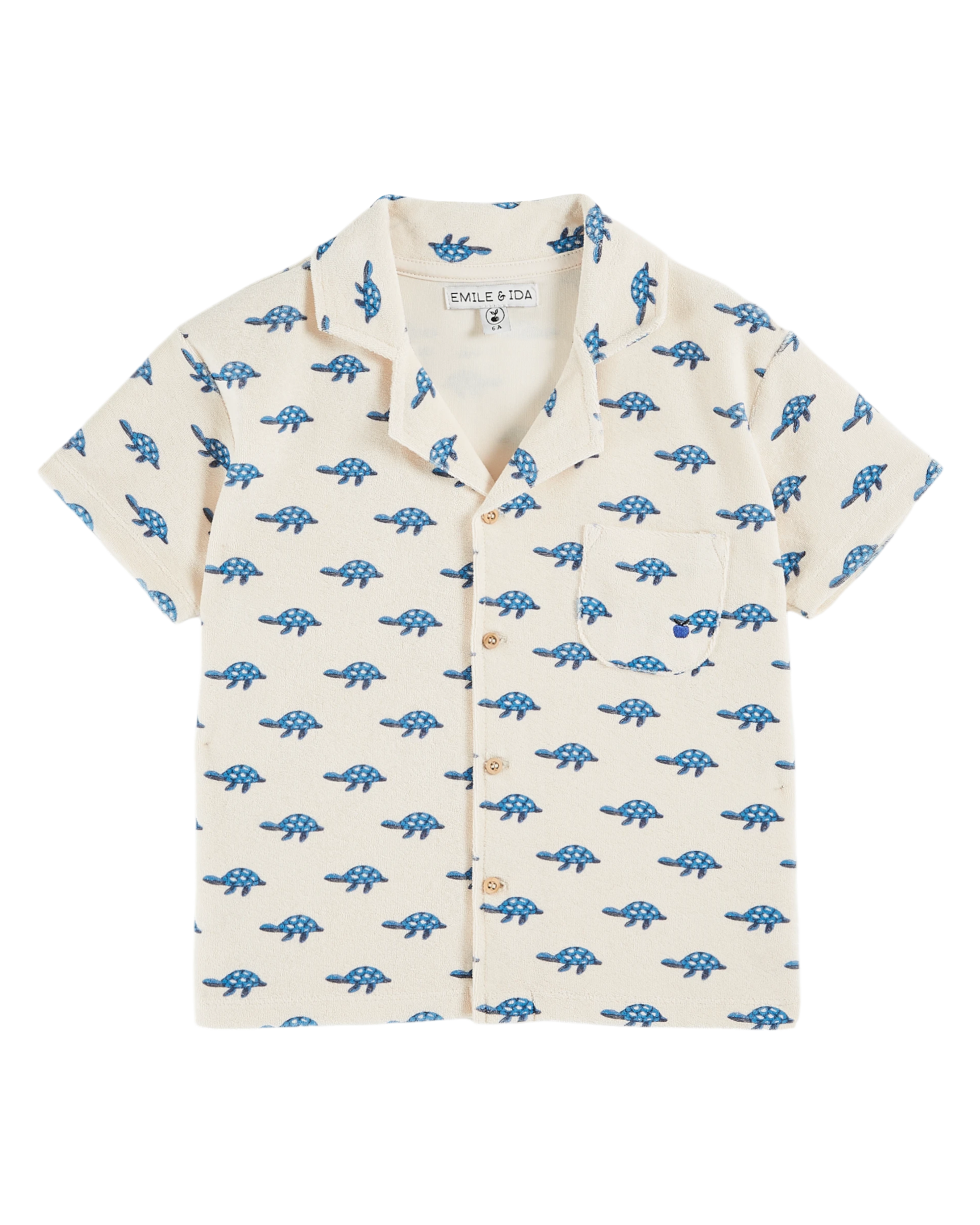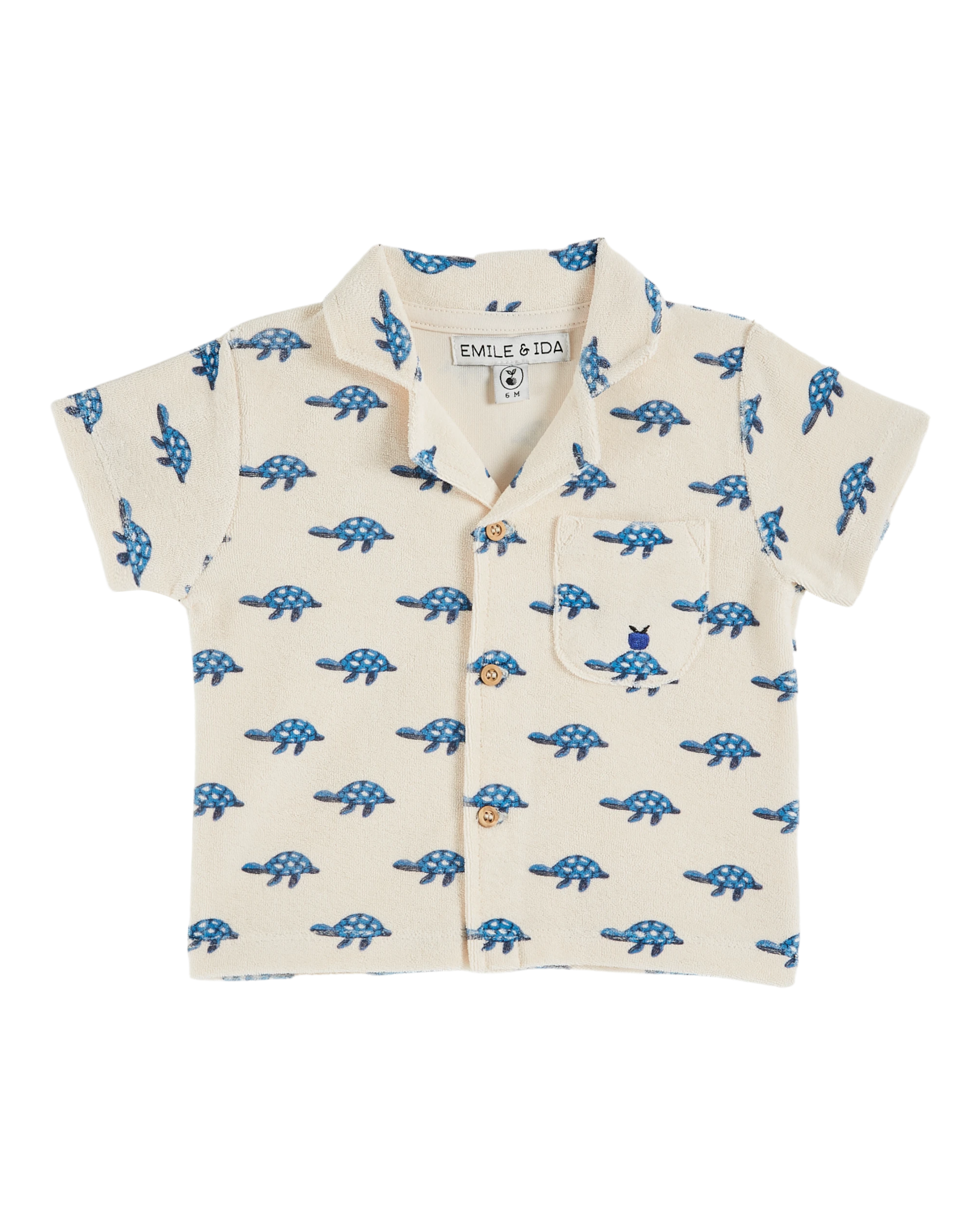 Off-white terry cloth short-sleeved blouse printed with blue turtles. It features a small tailored collar, two short sleeves and a chest pocket adorned with a small black embroidered apple. Wooden buttons close the blouse all the way up, offering comfort and practicality. Crafted in ultra-soft, plush, stretchy terry velvet, it offers unrivaled comfort.