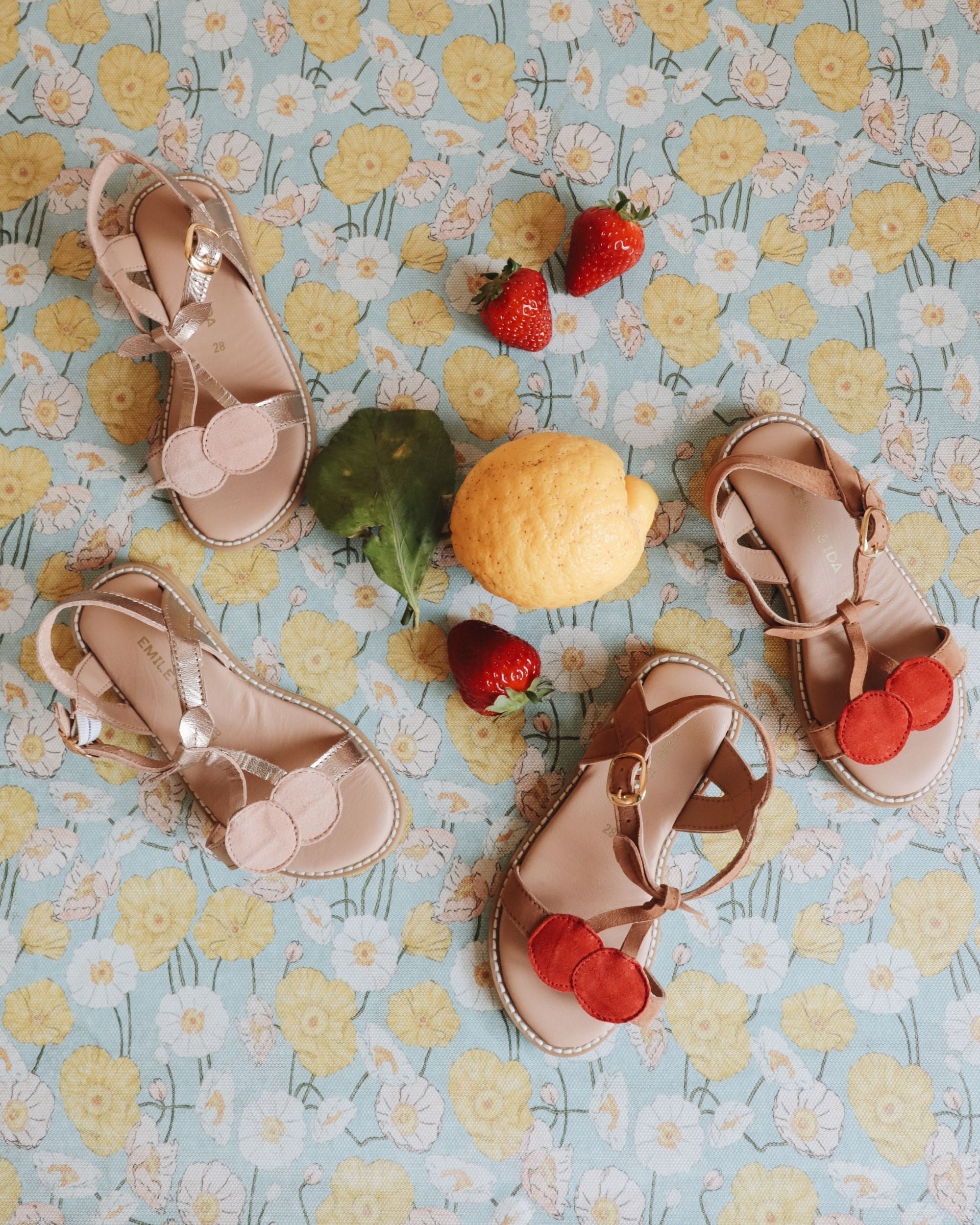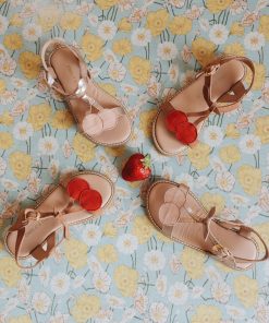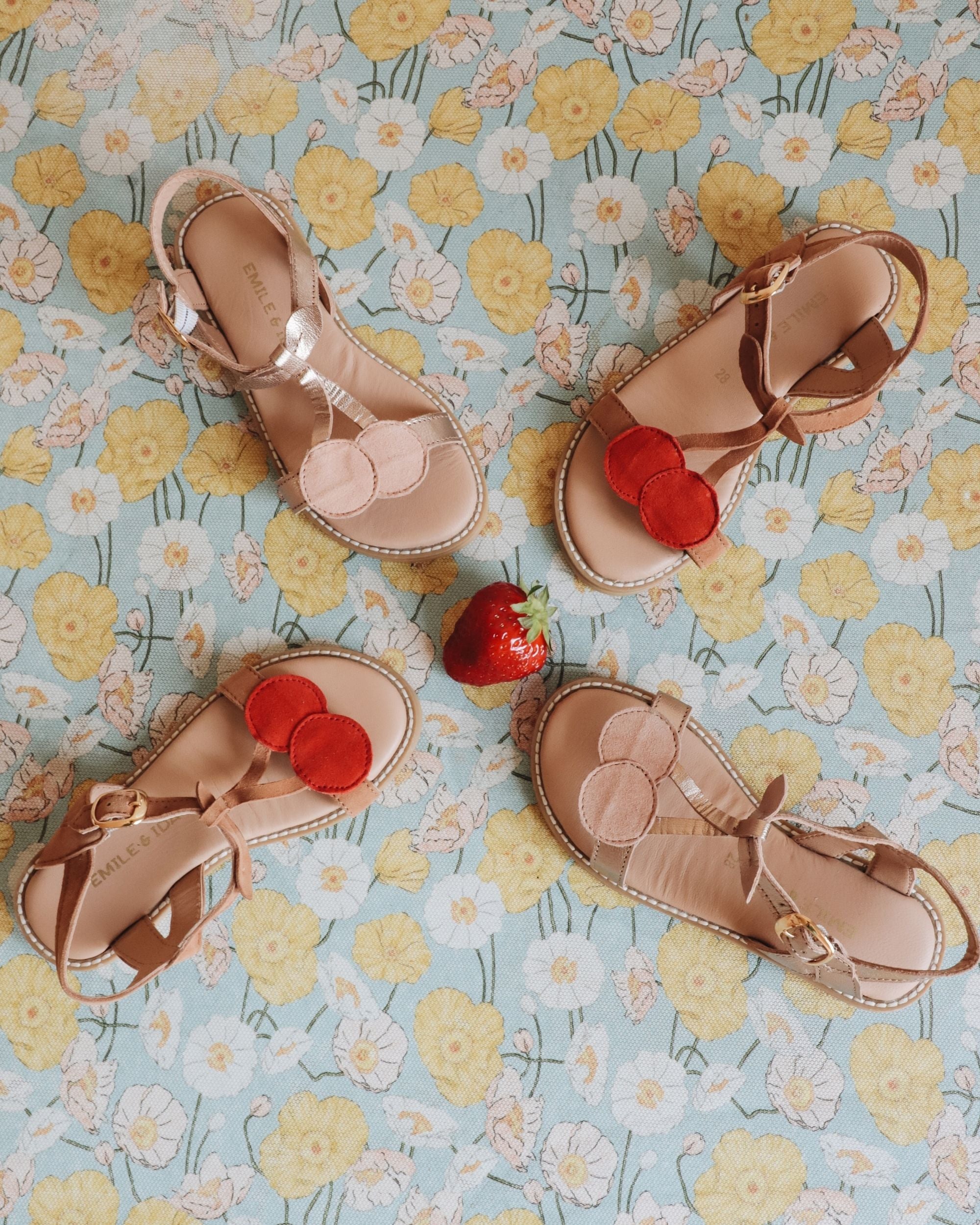 Beige suede goatskin sandals. They feature a strap on the top of the foot adorned with two pretty red cherries, linked by their tails to the ankle strap. The ankle strap closes with a gold buckle, adding a touch of elegance. The padded insole ensures optimum comfort, while the smooth leather lining offers a neat, wearable finish. Size advice: Take your usual size