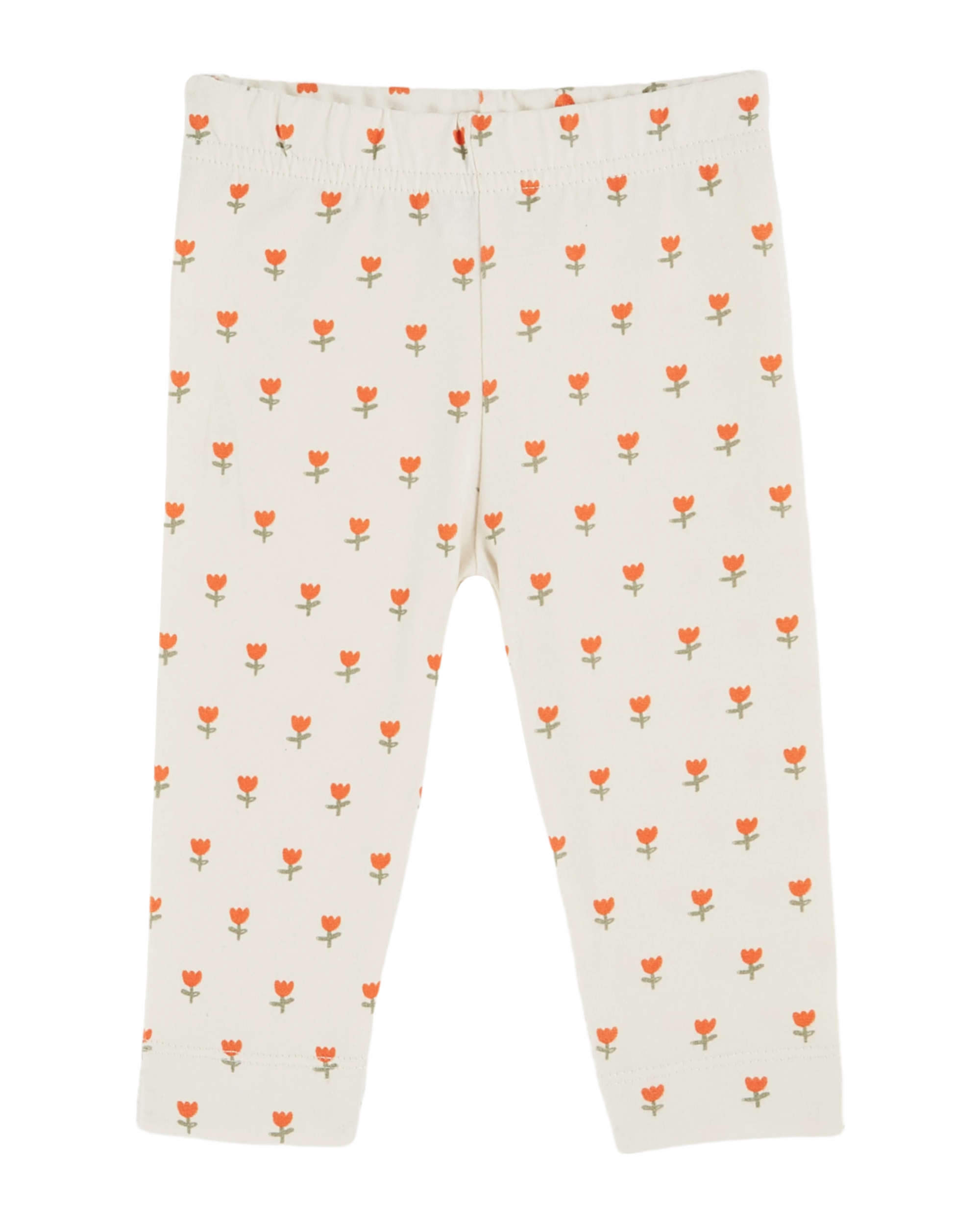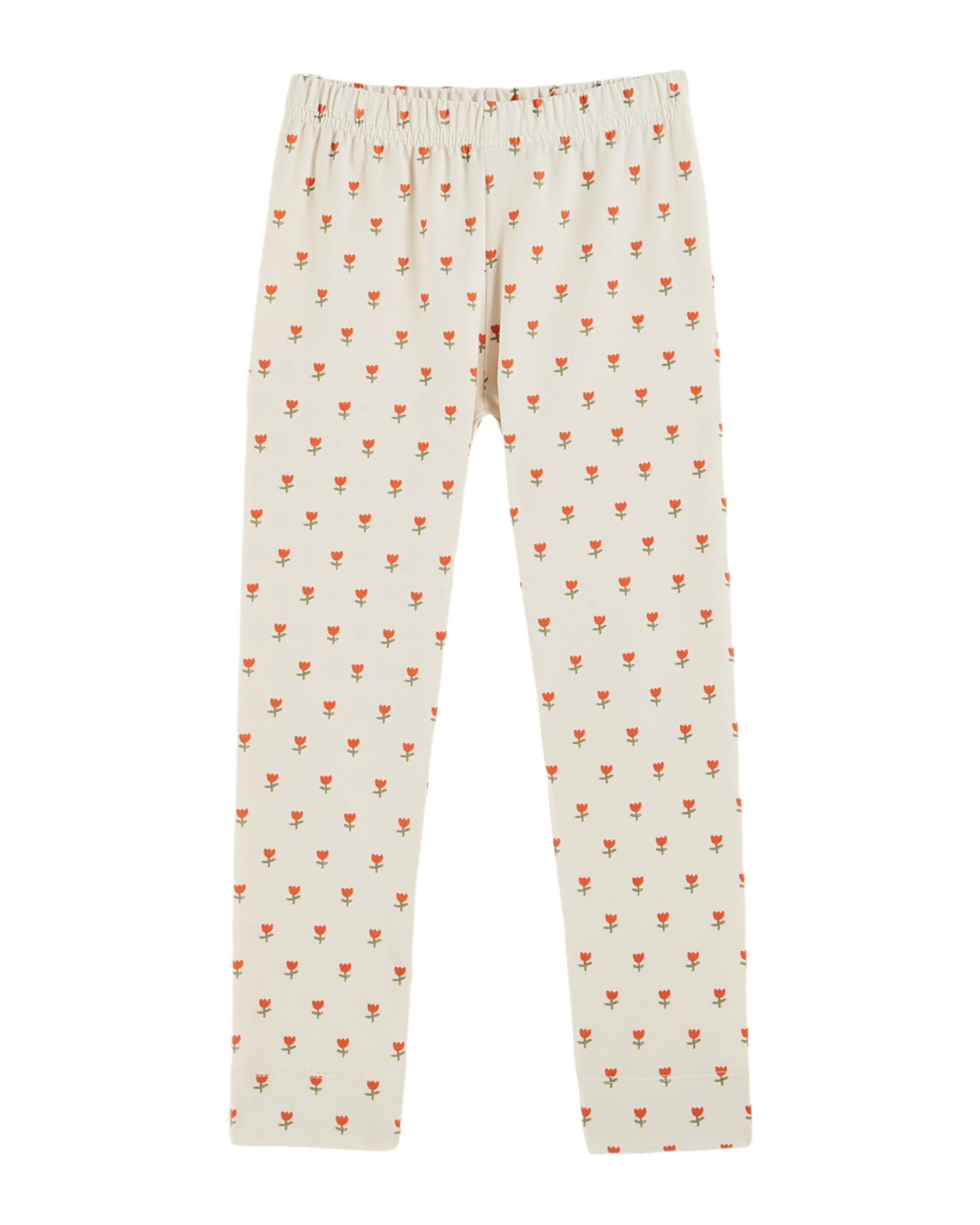 Cotton and elastane jersey legging sown with vermilion-red tulips on an off-white background. With its elasticated waistband and soft organic fabric, these leggings are an original basic that goes with any outfit.