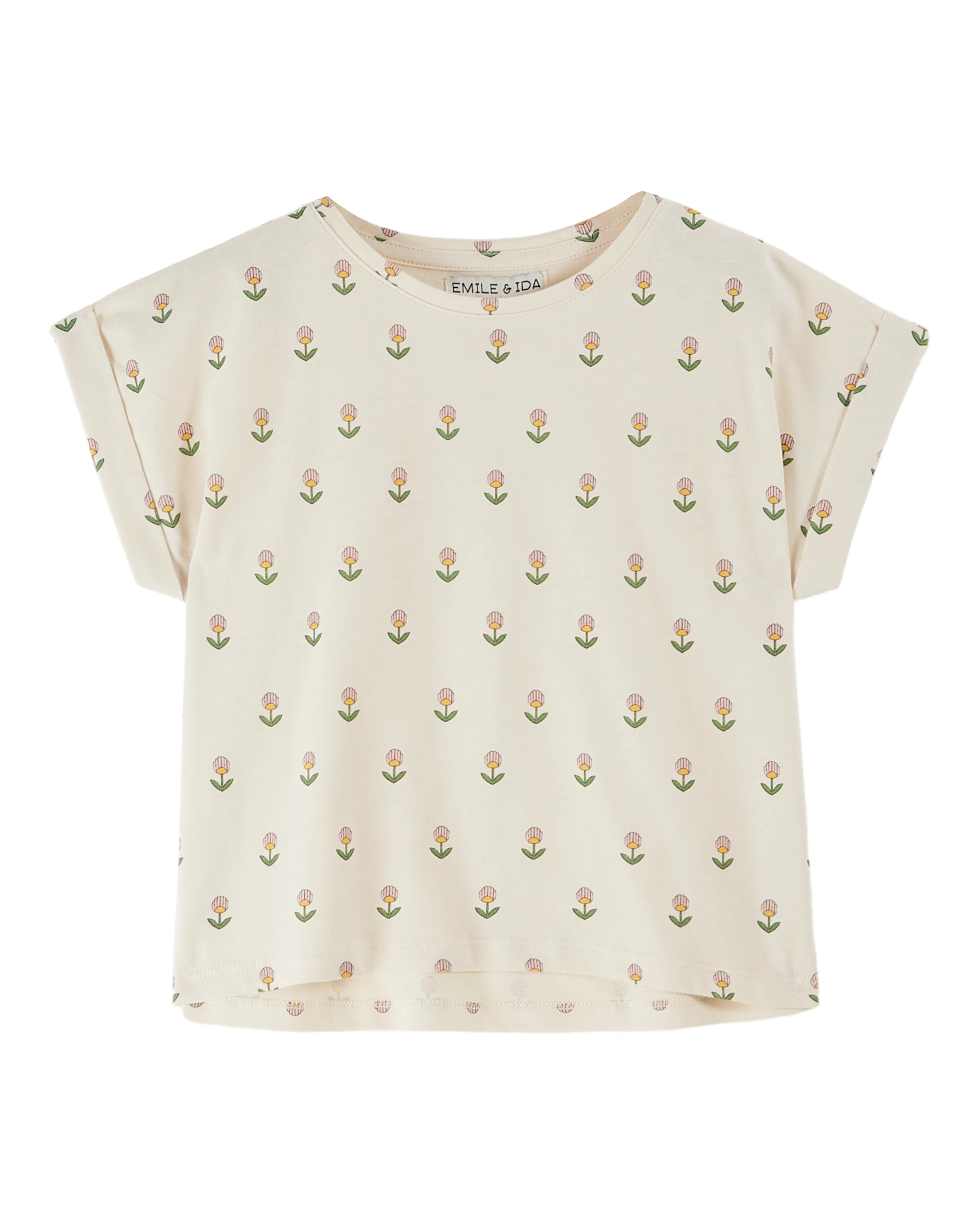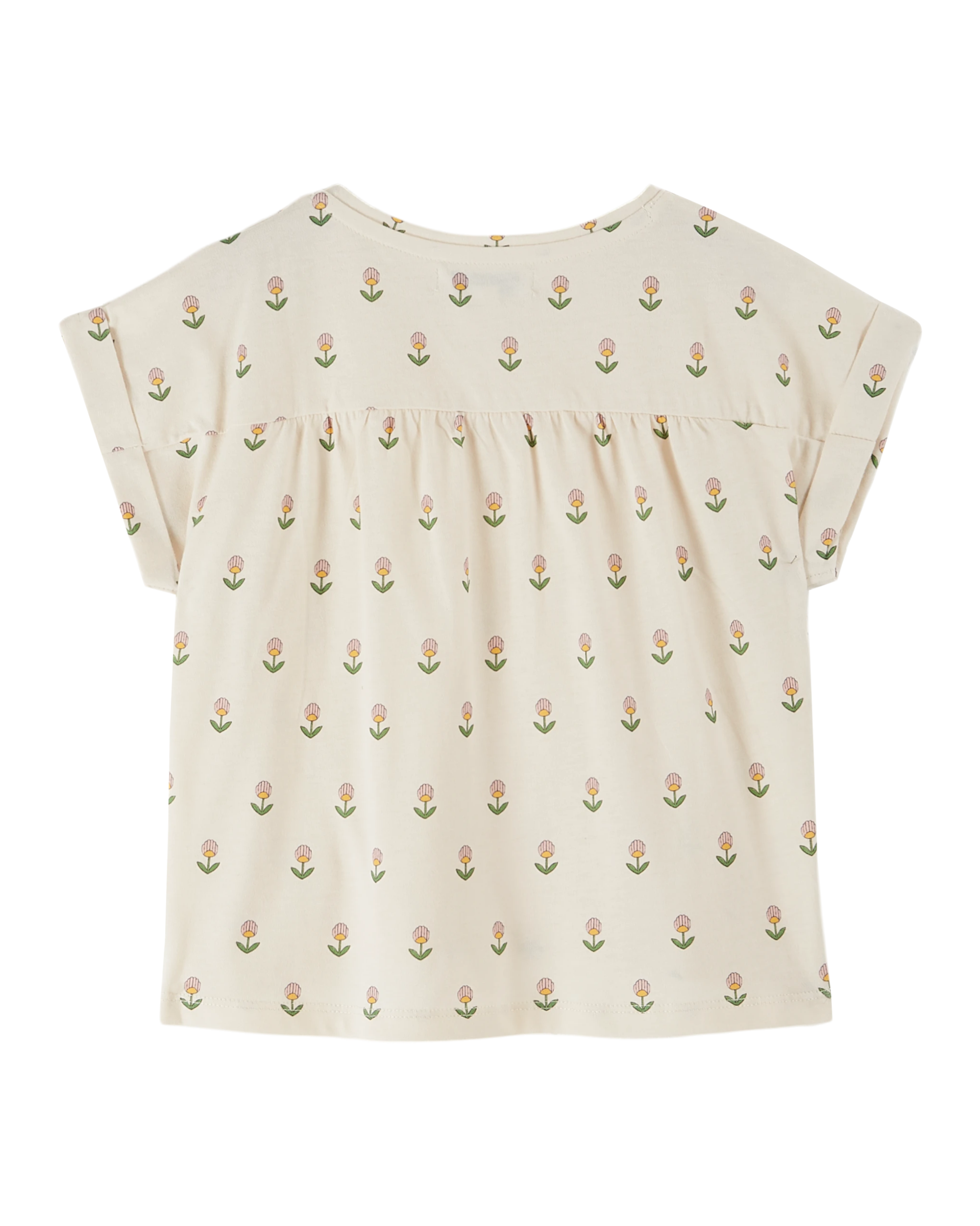 Tee-shirt in organic ecru, adorned with beautiful flowers with pink petals, delicately aligned. This basic from the Émile et Ida collections is as popular as ever, thanks to the softness of its organic cotton. Its short cuffed sleeves and ribbed neckline add a touch of refinement. A yoke at the back supports the gathers, creating a lovely fullness.