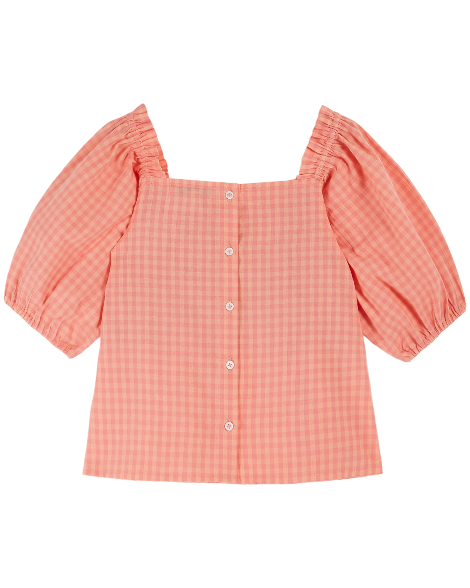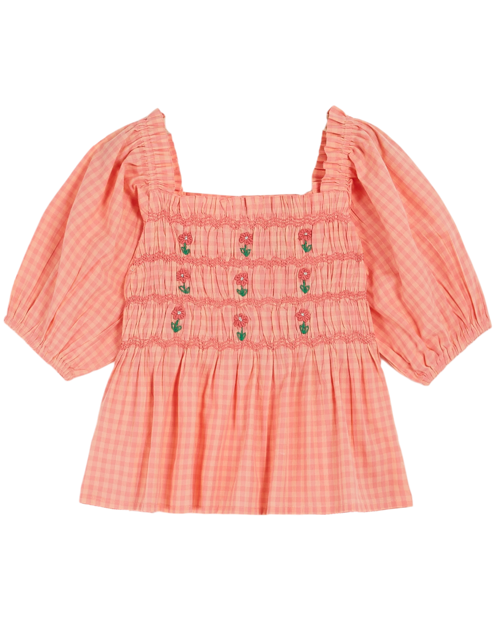 Pink gingham cotton blouse with balloon sleeves. Four lines of handmade pink smocks define the yoke, between which flowers with gold lurex hearts are embroidered. The underside of the smocks is lined in cotton voile for added comfort. An elasticated flounce on each shoulder finishes the square neckline. Natural mother-of-pearl buttons all the way up the back close the blouse.