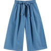 Off-white cotton blouse printed with blue flowers. Elasticated balloon sleeves, natural mother-of-pearl buttons, gathers around the neckline, English seams that reinforce the solidity of the assembly and ensure the durability of the piece for subsequent children. Then there are the details that make this blouse unique. The bottom sleeves are hemmed with picot stitch, the first two buttons are sewn in crow’s feet like flower embroidery, and the flat collar is scalloped like petals, ending with a narrow flounce.