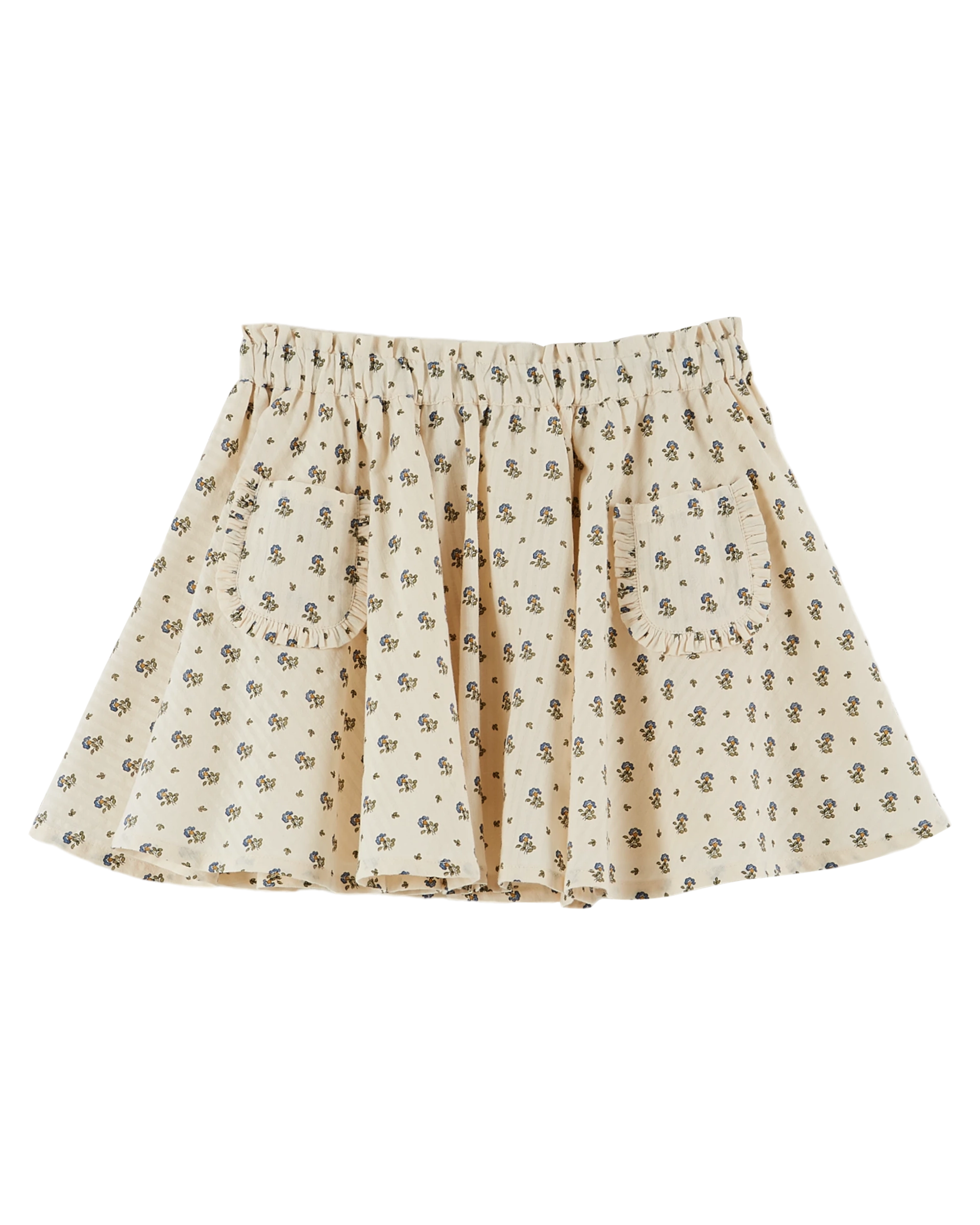 Short skirt in ecru Dobby cotton, lined with matte and shiny stripes and printed with delicate blue flowers. You’ll appreciate the quality and finesse of the soft fabric and the ample shape provided by the gathers supported by an elasticated waistband with a ruffled effect, and the patch pockets surrounded by a frill that will conceal even the smallest treasure. Fully lined skirt. Dobby weaving, named after the loom on which it’s produced, allows you to create patterns, color effects and add texture like honeycomb, embossed, quilted.