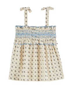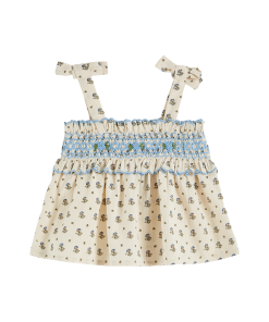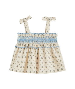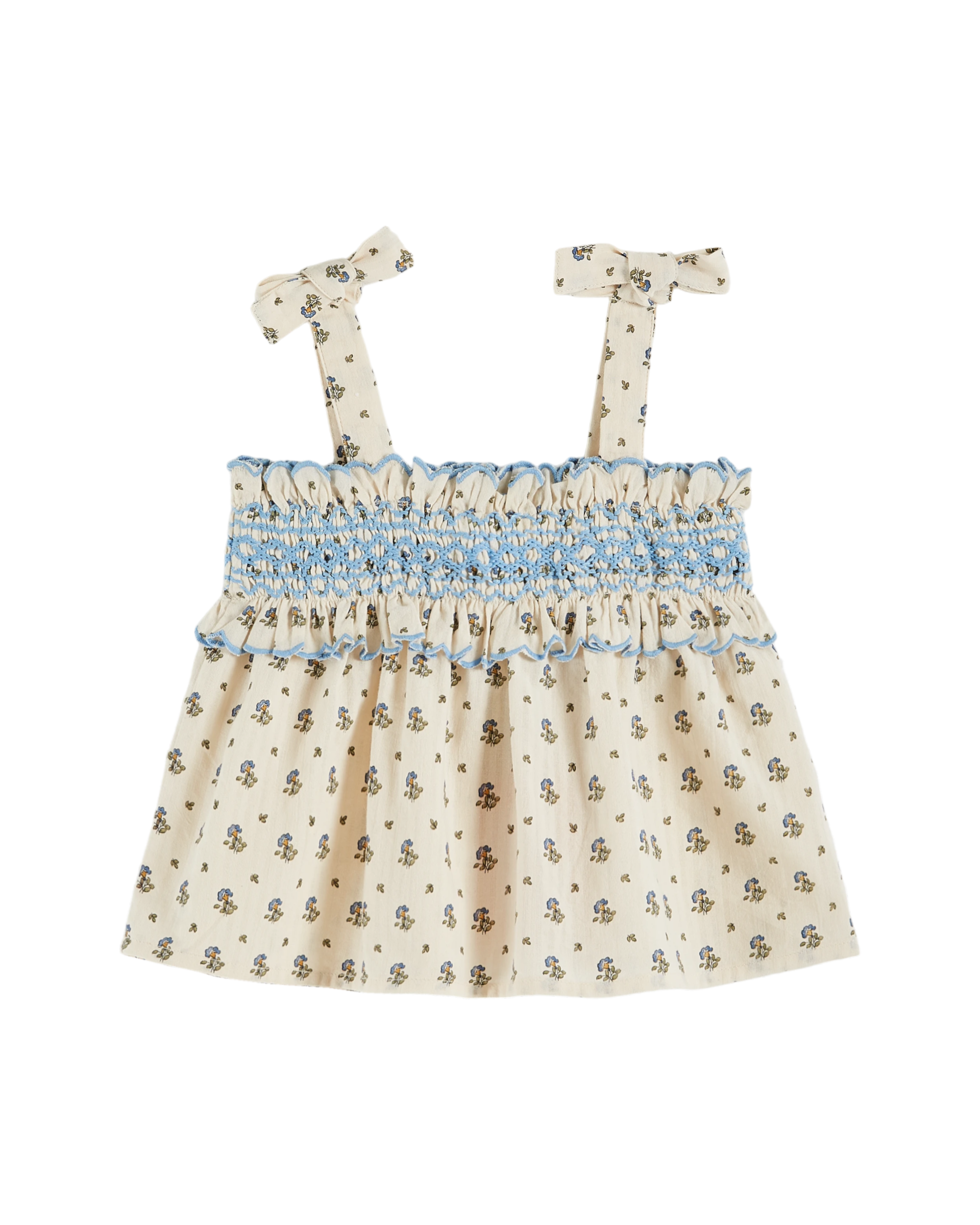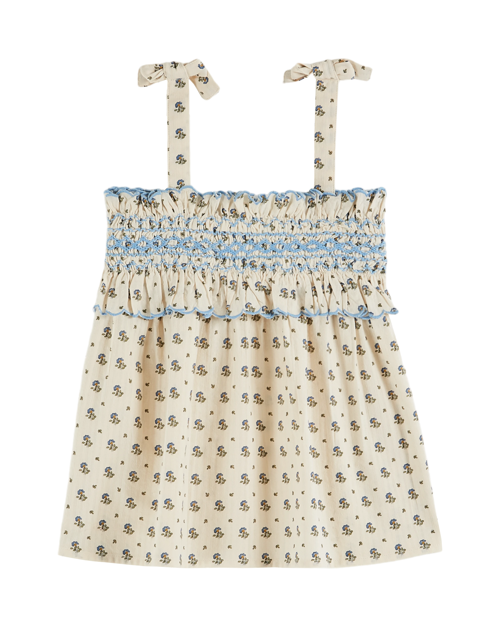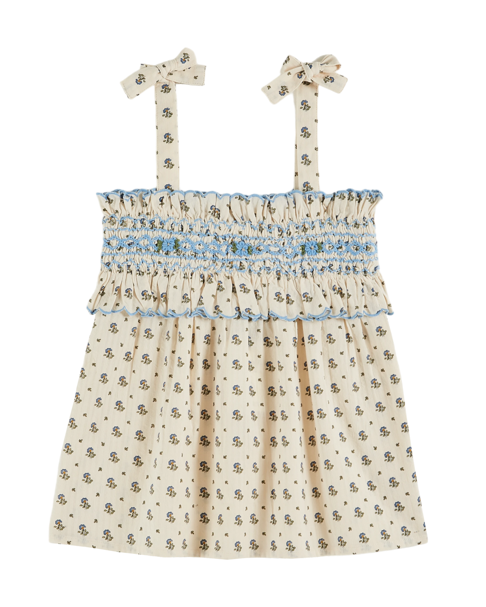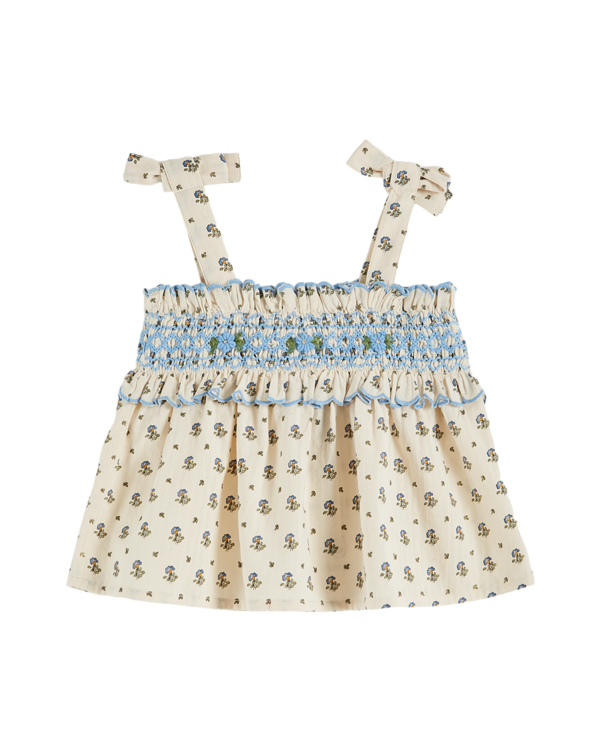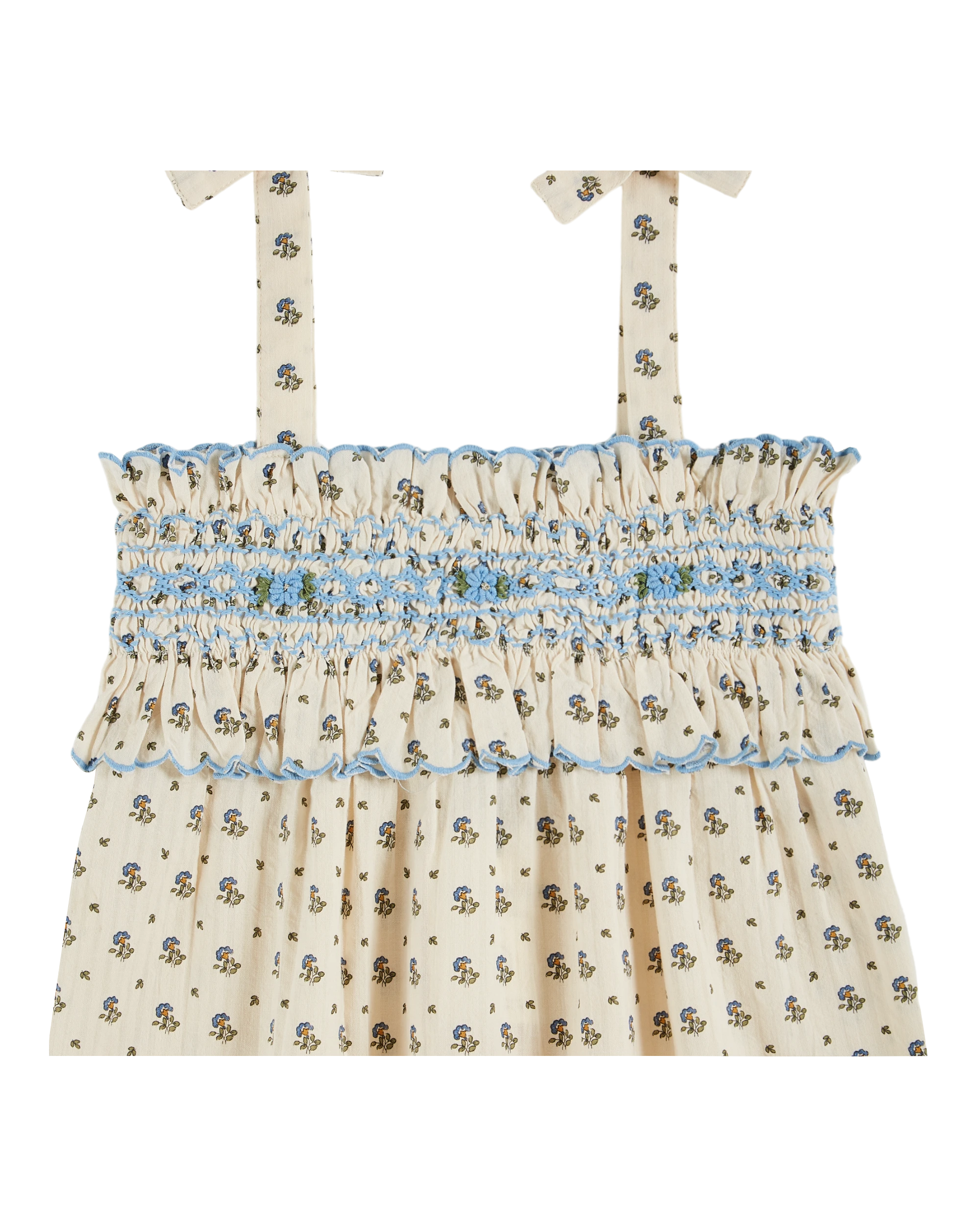 Off-white cotton strapless top dotted with blue flowers. The attached band around the bust, all scalloped and hemmed with satin stitch, is adorned with blue elasticated smocks. These are hand-embroidered, giving this top a bohemian chic edge.