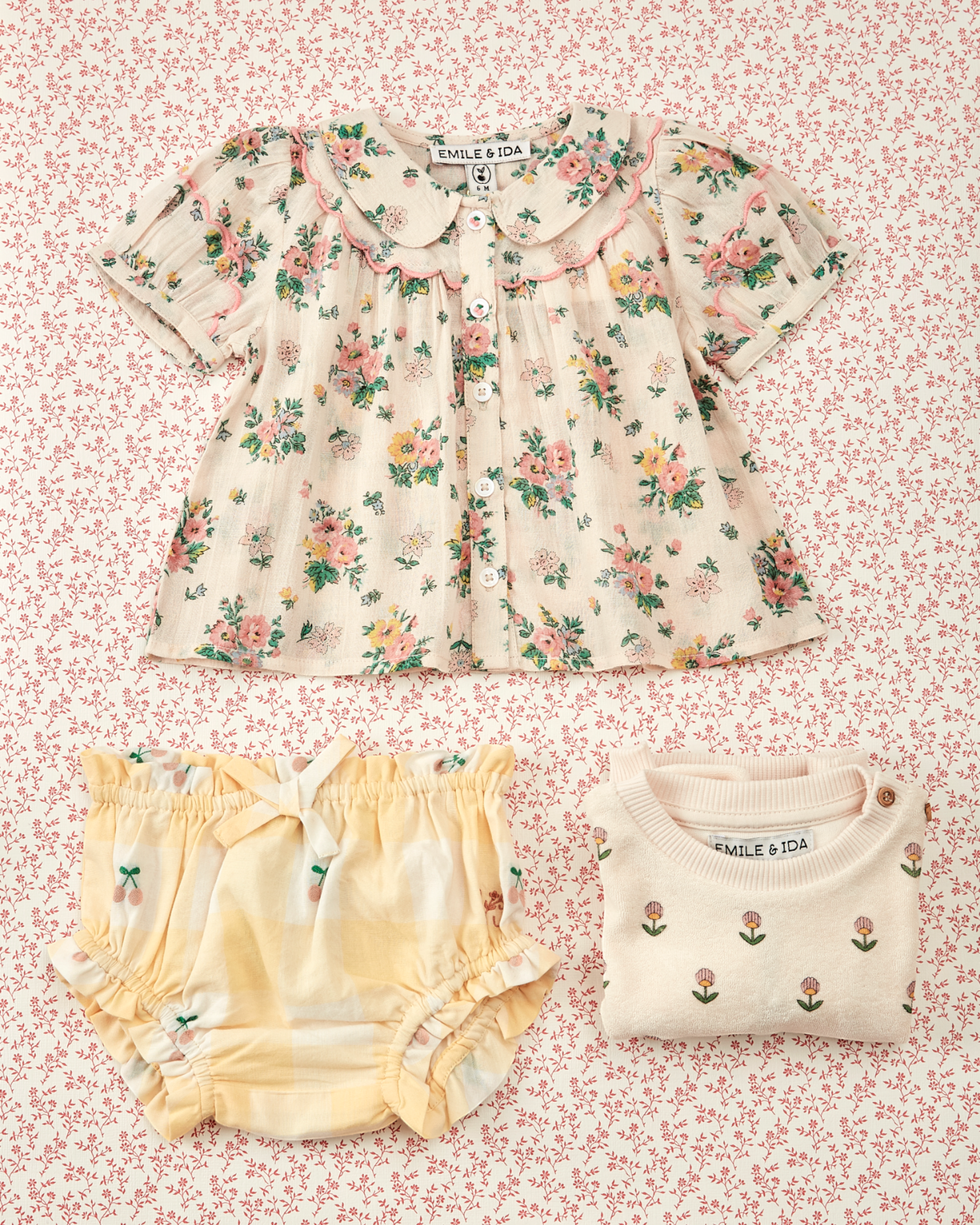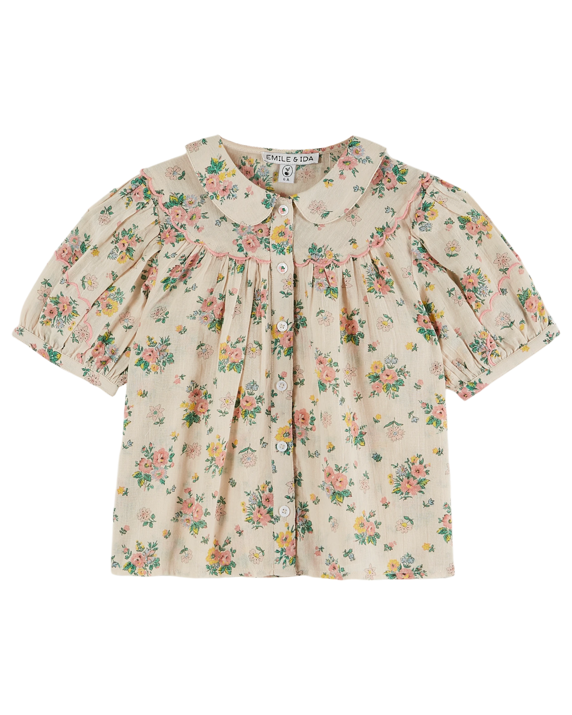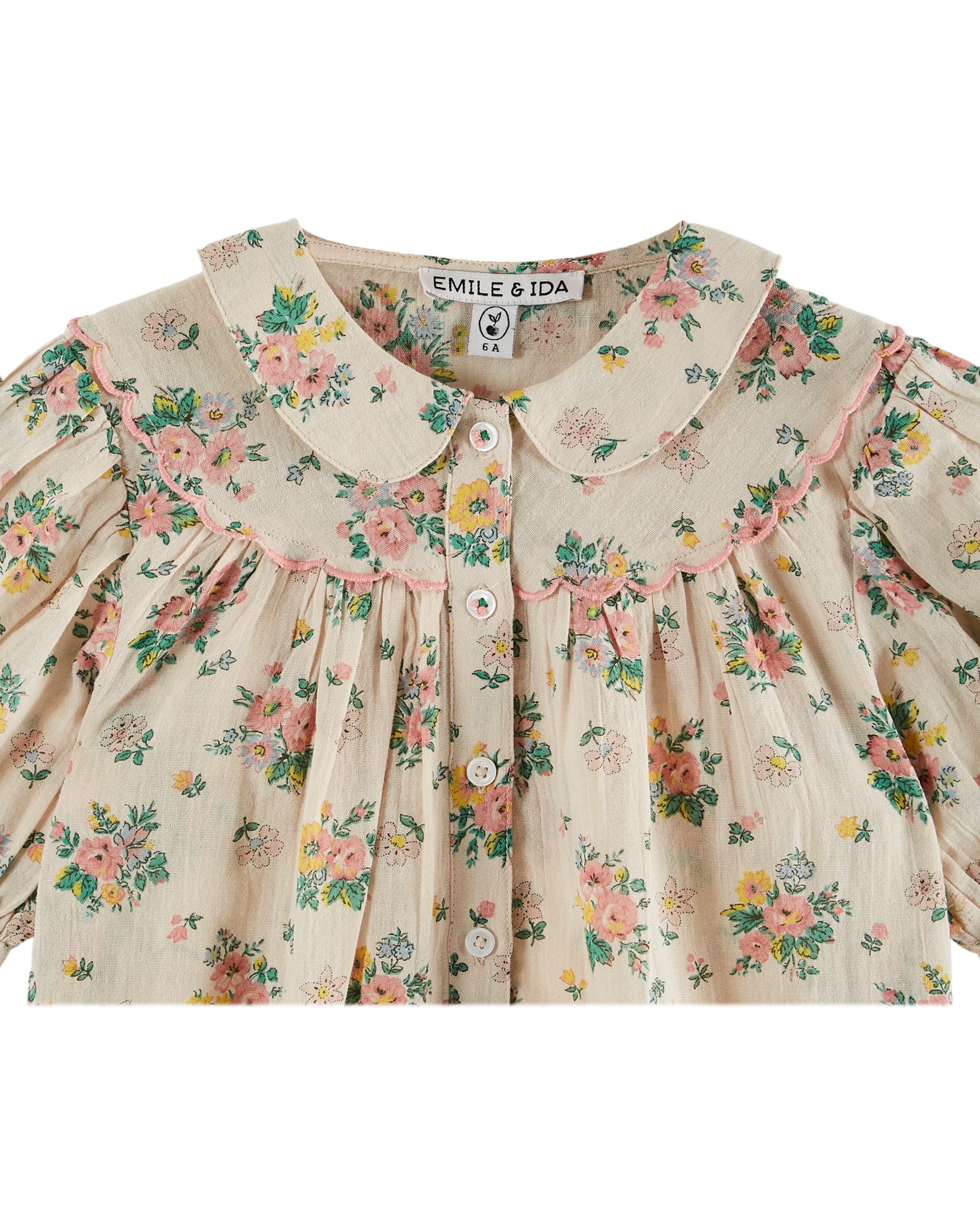 Powder-beige cotton blouse dotted with bunches of flowers. A blouse in a poetic print, with a flared cut whose circular, scalloped yoke is edged in pale pink satin stitch. It emphasizes the Claudine collar and supports the gathers on the bodice that give the blouse its fullness. It opens and closes all the way up with beautifully stitched natural mother-of-pearl buttons. The scallops of the yoke are repeated on the balloon sleeves.