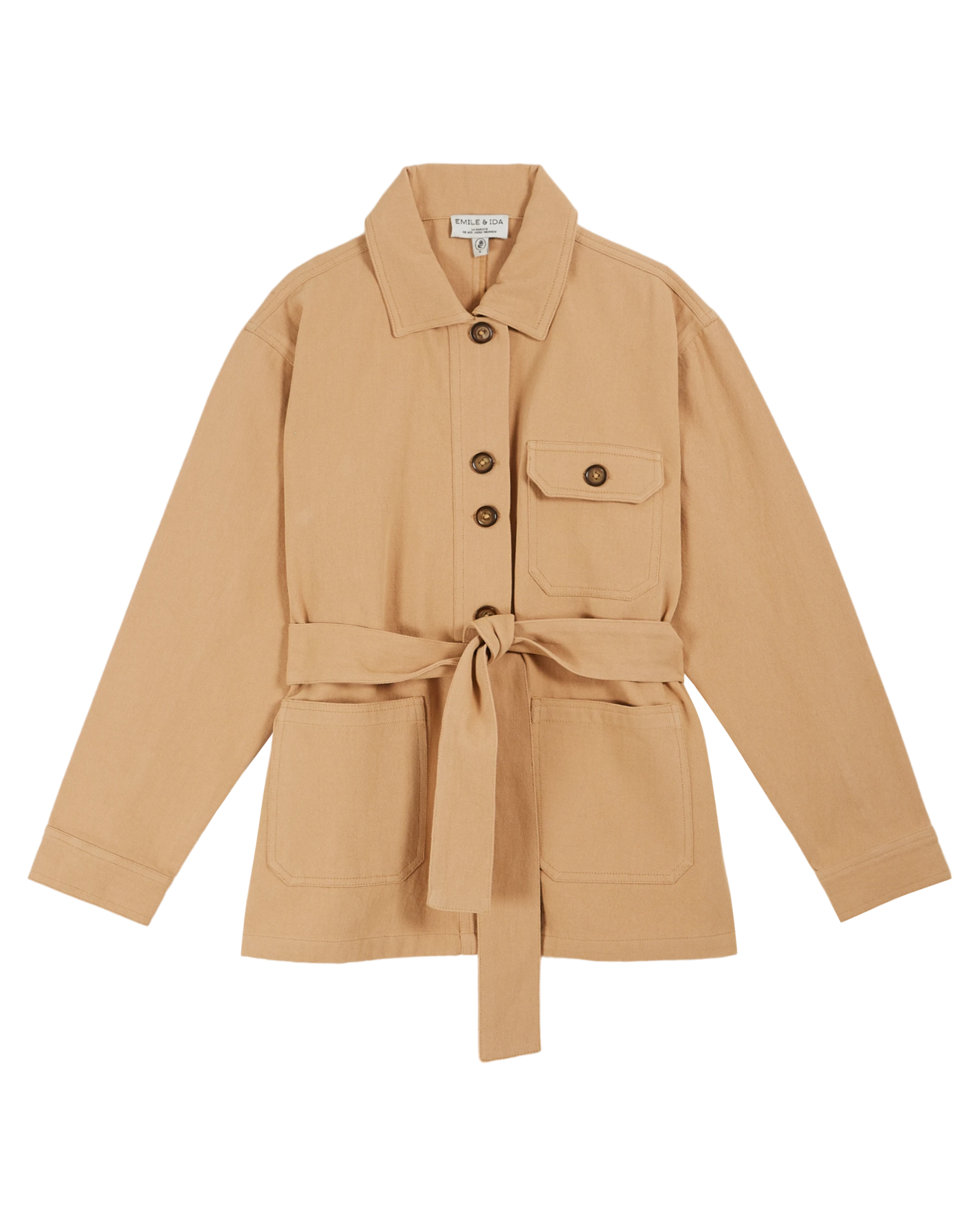 It features spacious patch pockets and a flap pocket positioned over the heart. A belt that slides through loops allows you to adjust the waist to your liking, subtly emphasizing the silhouette.