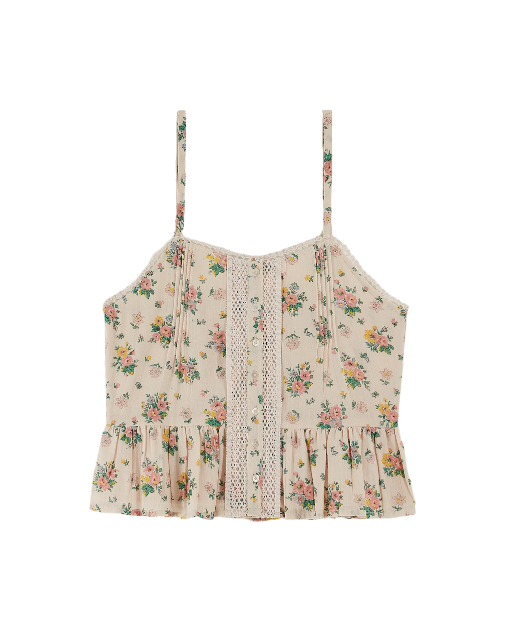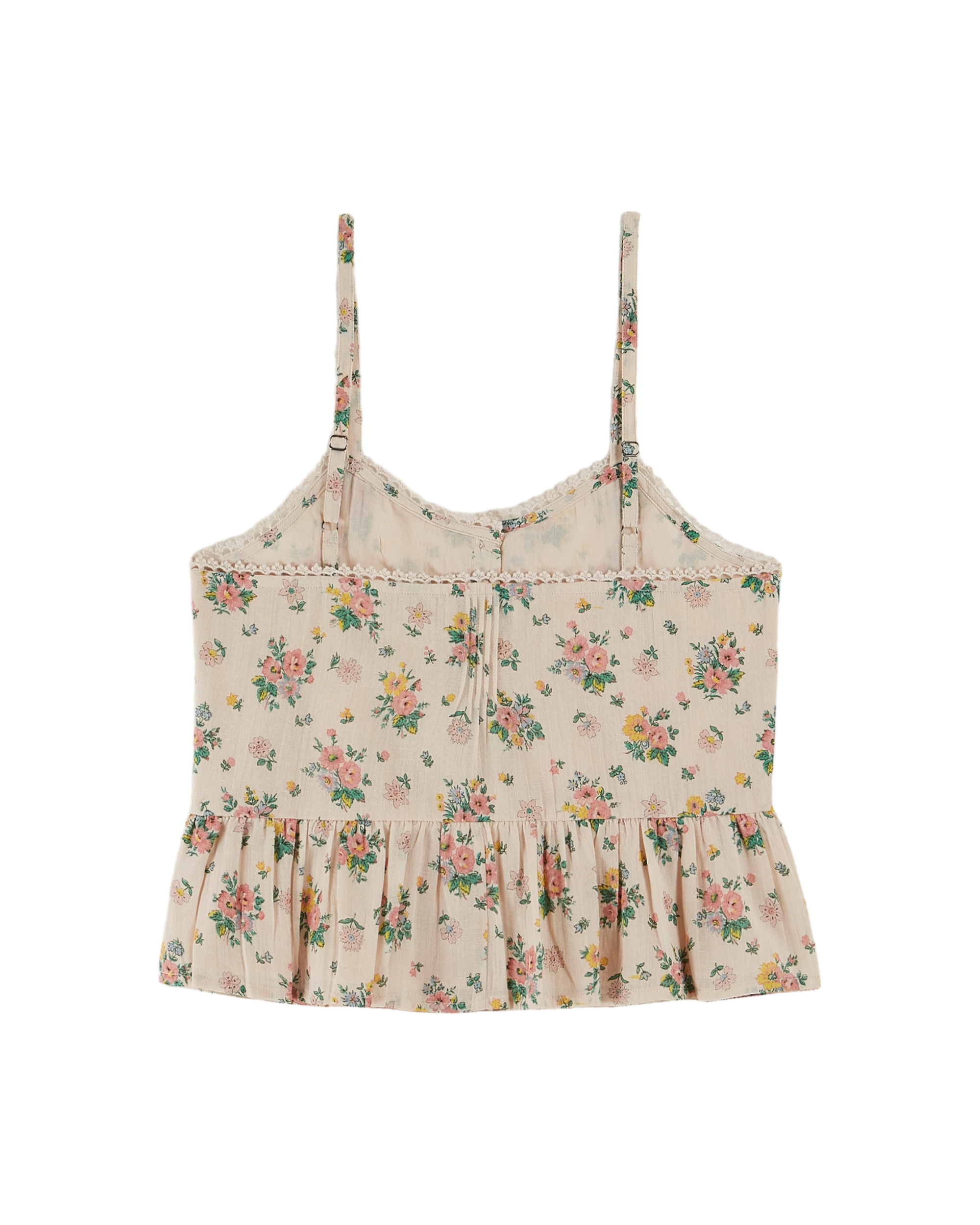 This soft, lightweight cotton gauze camisole is adorned with pastel-hued flowers. Its delicate powder-beige background highlights the subtle floral motifs. This model features thin, adjustable straps and a ruffle reminiscent of the original basque.